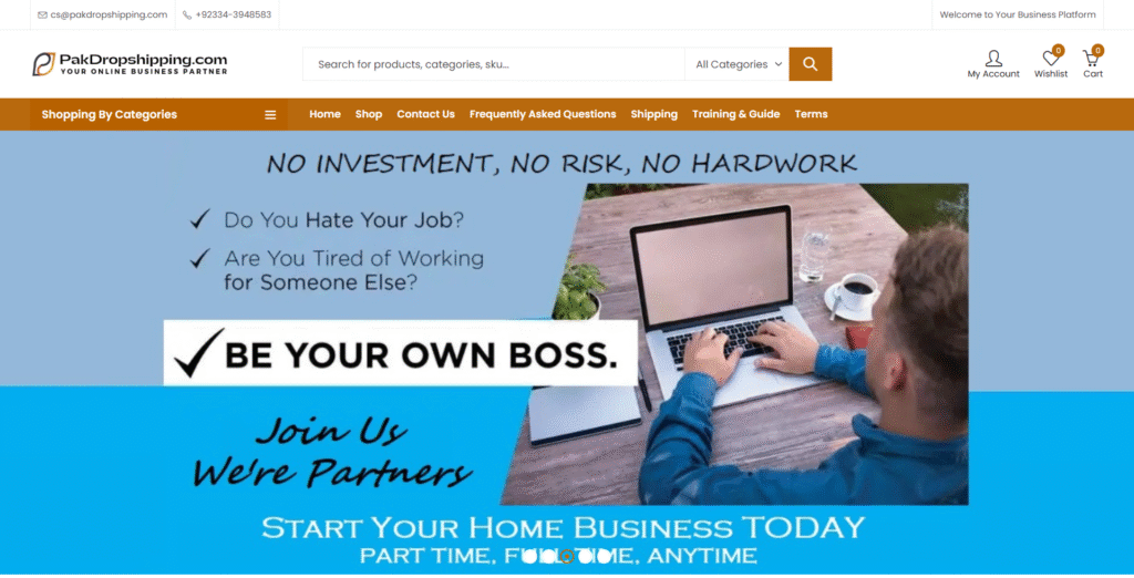 Dropshipping.com.pk is a Pakistan-based platform offering a mid-sized product catalog of approximately 4,000 SKUs. It includes a balanced mix of categories like fashion, electronics, household items, and general merchandise. The platform is often used by new sellers entering the market who are looking for a straightforward way to begin without managing too many tools or suppliers.